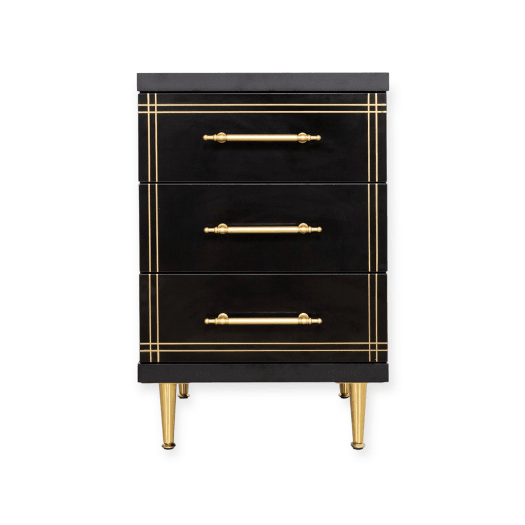 Featuring three spacious drawers, smooth gold-finished metal handles, and tapered gold metal legs, the ST-19 Black combines functionality with striking design. Its compact size makes it ideal for placement beside barber chairs, styling stations, or reception areas where both style and practicality matter.