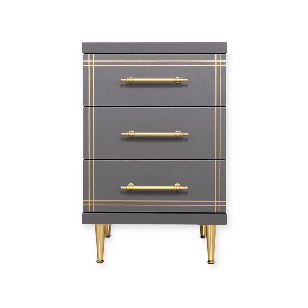 Equipped with three spacious drawers, gold-finished metal handles, and tapered gold metal legs, the ST-19 Grey offers both visual elegance and practical functionality for everyday professional use.