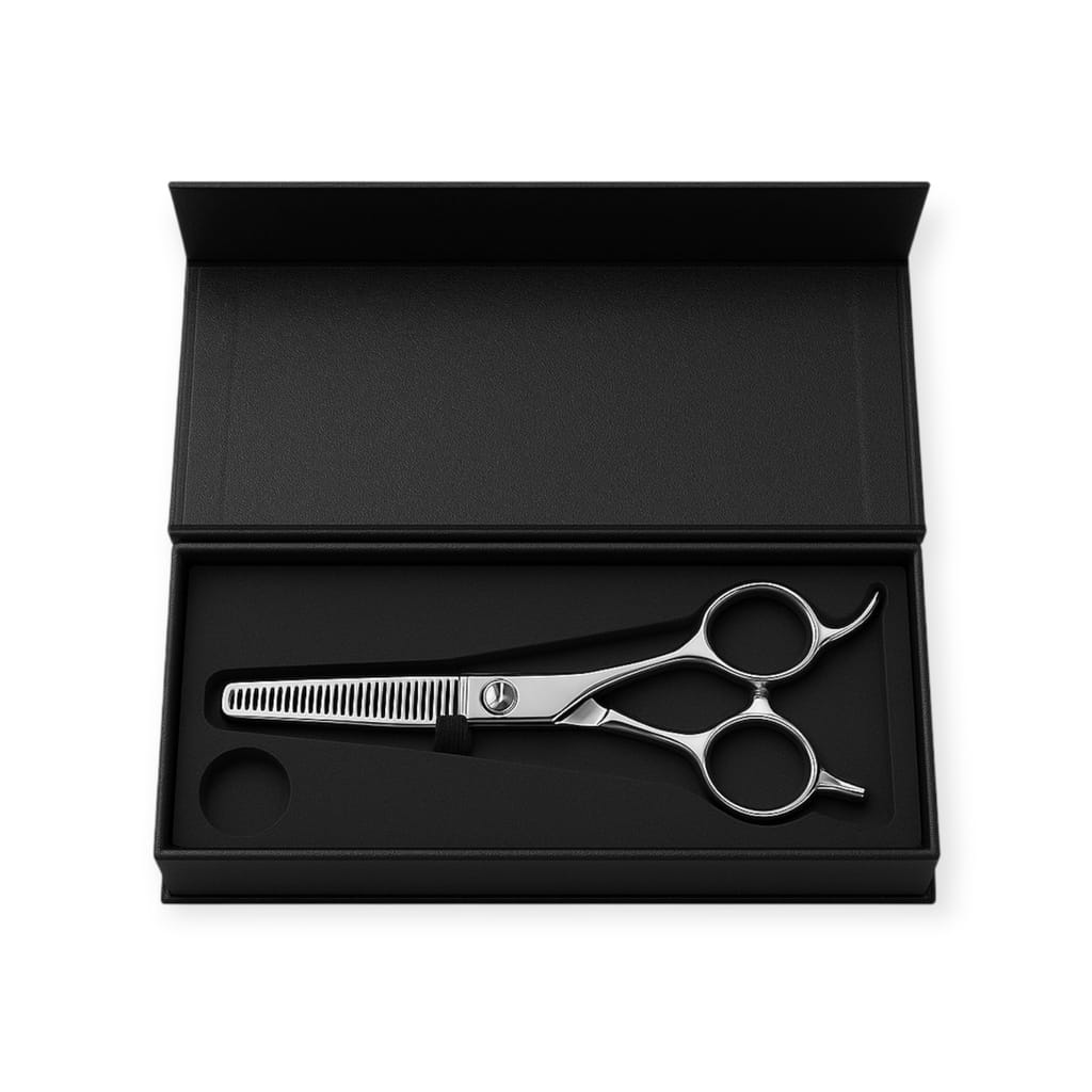 The 6.0-inch size provides excellent balance and maneuverability, while the ergonomic handle ensures comfort during prolonged use. Supplied in a luxury protective box, this thinning scissor is a reliable tool for daily professional salon and barbershop work.